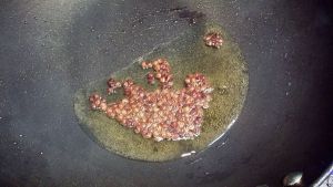 碗上面放些许小葱,干辣椒,锅中少油烧开倒入碗中