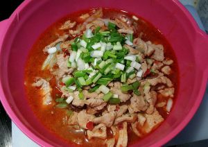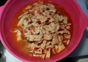 锅内放少许橄榄油,加入葱蒜爆香,然后加入郫县豆瓣酱爆炒,添水至水开后放入腌渍好的里脊肉。