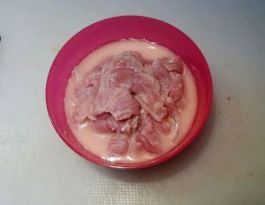 猪里脊肉切薄片,加入化好的水淀粉、鸡蛋、味极鲜、糖、料酒腌渍10分钟左右。