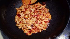 待锅内的里脊肉变色后放入事先煸炒好的蔬菜。翻炒几分钟后倒入准备好的容器中。