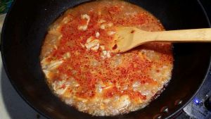 锅烧热,再倒入40克油,放入郫县豆瓣和姜末炒香,直到炒出红油。