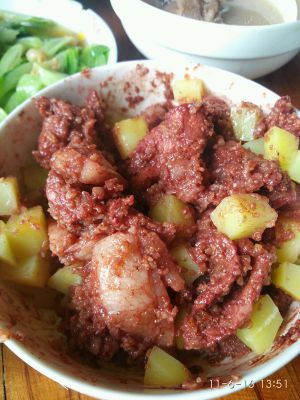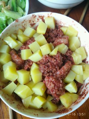 把肉裹上米粉 土豆垫底肉放上边给它摆整齐将剩下的汤汁淋在裹好的粉蒸肉上边 这样蒸出来的肉不容易干巴巴的