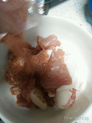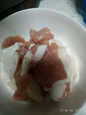 五花肉中倒入调好的料汁、搅拌均匀,用保鲜膜封碗放在冰箱半小时。