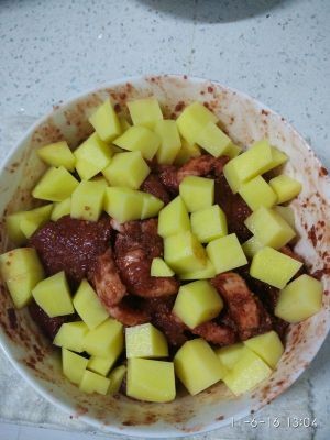 土豆去皮切成大块就行 用少许味极鲜 盐 鸡精抓拌均匀腌制三分钟即可