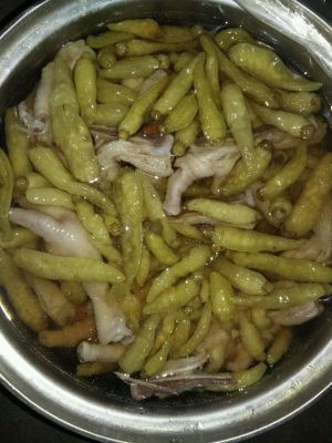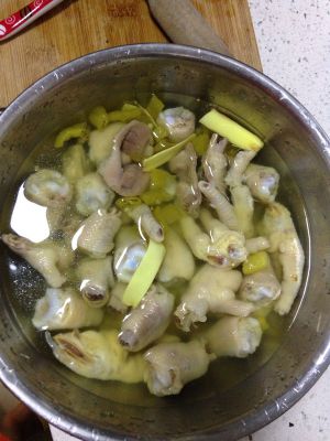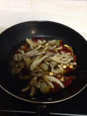 锅内注入清水,放入辣椒干,大料等,放入鸡爪,烧大概10分钟左右