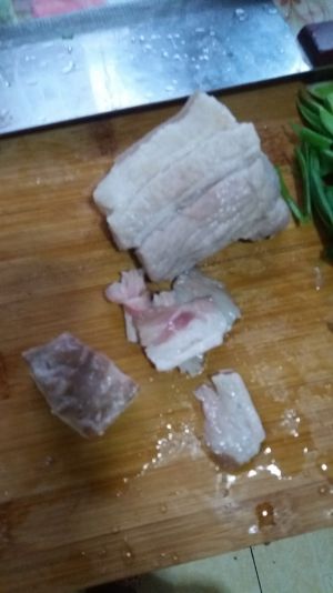 一大块五花肉,先放进锅里煮一下,五分钟肉变色就可。之后切成薄片待用。