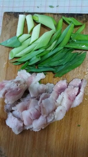 蒜苗洗完切斜刀,葱姜准备好。开火倒油,葱姜,豆瓣酱,料酒,老抽,少许糖,盐,炒起来呵呵