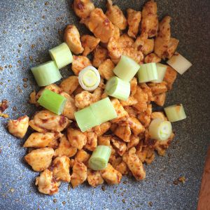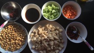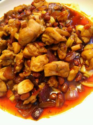 鸡丁放进去炒。然后加入调好的汁。放花生米勾芡装盘就行了。