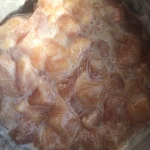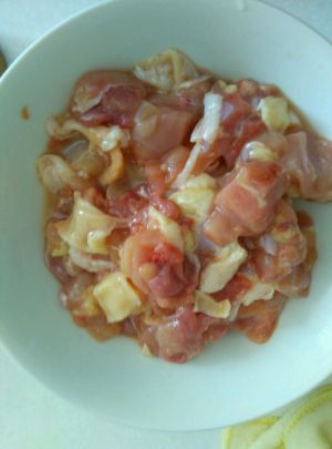 鸡肉加淀粉,盐,少许料酒,蛋清,抓匀腌十分钟左右。