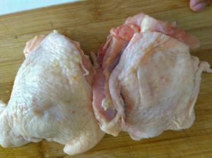 将鸡肉铺在案板上,用刀背拍松,再切成2厘米左右的肉丁。