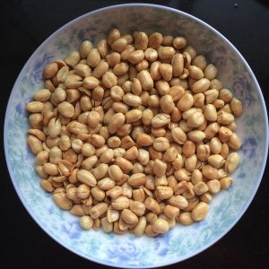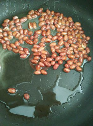 生花生米,用开水浸泡,剥去外皮。锅中少量油,小火炸成金黄色,晾凉,装盘备用。