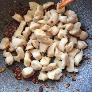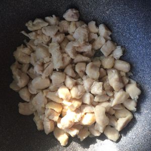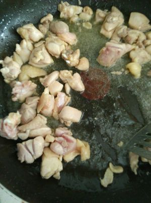锅中倒入适量花生油,滑入鸡块,鸡块变白即可,盛出备用。