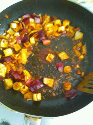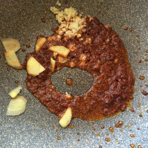 热锅放油烧热,加几颗花椒,放豆瓣酱,煸炒出红油。再放洋葱丁,大葱,姜蒜片爆香。