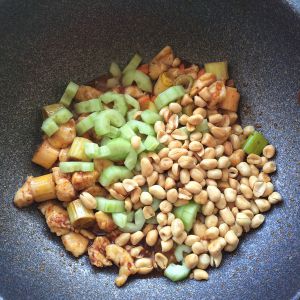加入炸好的干辣椒,黄瓜丁和炒好的花生,翻炒均匀。