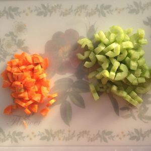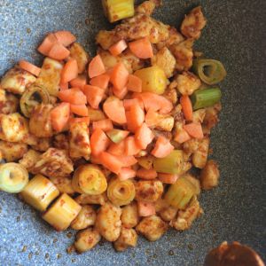锅里下油爆香蒜末,下胡萝卜翻炒至软