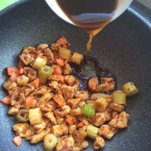 放烤熟的鸡米花,加少许清水翻炒3分钟