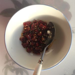 自制的一瓶芝麻辣椒油,取出适量备用。