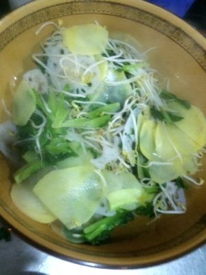锅里下冷水,藕片洋芋片、豆芽下锅煮至水沸腾接着下油麦菜一块煮