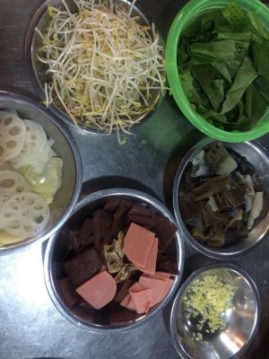 抄菜的水加了的盐,最后煮猪血和毛肚时加了姜片、葱段撇腥。