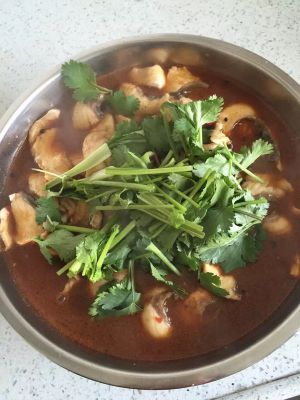 再煮开时依次放入香菜,蒜,鸡精,鱼,然后煮开时既可。其他配菜可以鱼吃完后再烫。