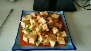 中火炒辣酱出香味,加入辣椒面、豆豉、糖,炒出红油后,加肉汤(或水),倒入豆腐烧3分钟,加酱油,水淀粉勾芡;
