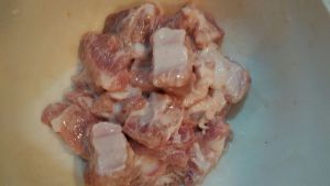排骨飞水绰过,放入高压锅中,加大葱段,拍扁的姜块,炖肉料包一个,还有料酒,加适量的水,用电高压锅压半小时左右,关火,取出大半熟的排骨