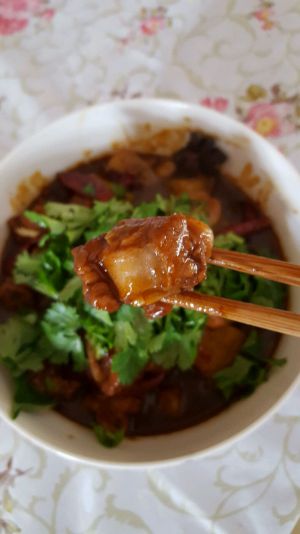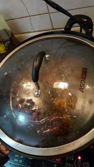 先将生姜大蒜花椒豆瓣炒香,倒入备用的排骨。倒水煮……