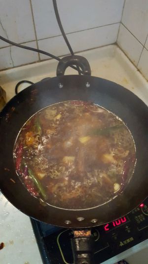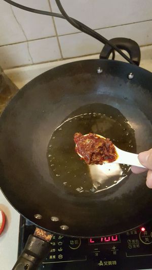 锅内放油,待油4分热,关小火,加入豆瓣酱翻炒至出红油,加入姜蒜干辣椒花椒和香料炒出香味