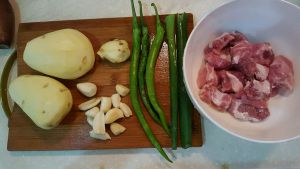 洗菜过后,老姜用菜刀拍扁,蒜和二荆条切成小截,土豆切块状放入水中备用。
