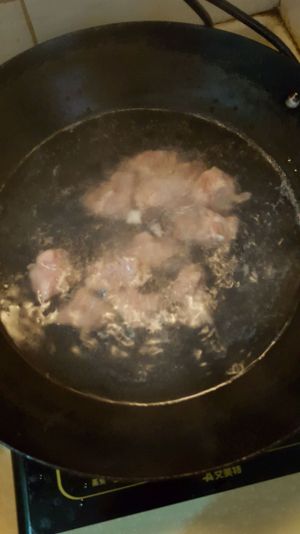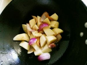 炒锅内放油,加入土豆块和刚才腌制排骨的调料一起翻炒,微变色后加入老抽,糖,盐