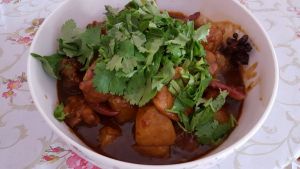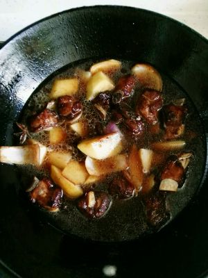 十分钟后,将土豆倒入锅中,再放些水继续煮。记得翻炒,以防粘锅。待排骨和土豆都软了就熟了。放入适量食盐和鸡精即可。