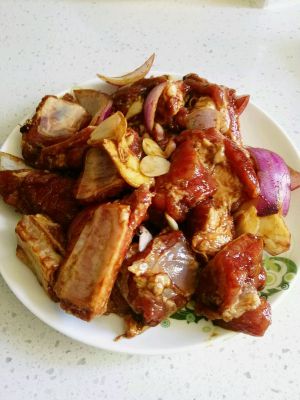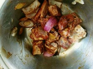 洋葱,姜,蒜,花椒,大料,盐2克,老抽5克加入排骨抓匀,腌制一个小时