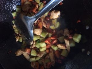 待鸡丁变色,加入黄瓜丁翻炒。