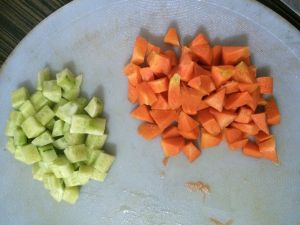鸡胸,胡萝卜,黄瓜,分别切成丁。切好的鸡丁放少许盐、料酒、淀粉进行腌制。