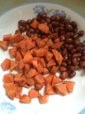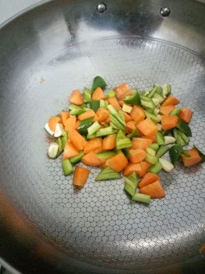 将花生米炸熟,胡萝卜丁过油。