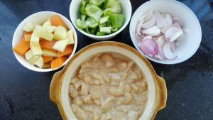 鸡腿去骨切丁,鸡皮可留可不留;