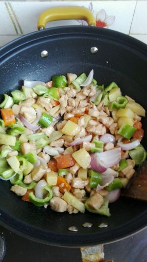 放鸡丁,青椒,洋葱翻炒
