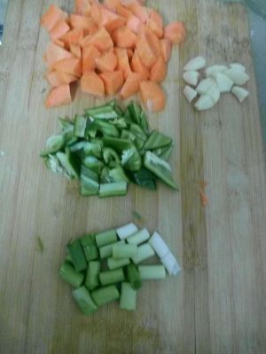 把把红萝卜青椒切滚刀块,蒜苗切段。