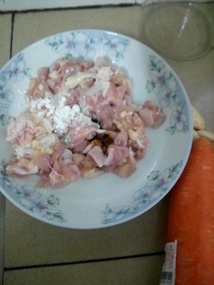 先将鸡肉切小块放少许料酒淀粉腌制。