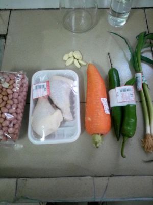 锅中留少许底油、下入大葱、干辣椒、花椒、姜片蒜片炒香下入鸡肉和花生翻炒、(然后兑点芡汁:用小碗加点水、盐、味精、鸡精、白糖、胡椒粉、酱油、醋、最后加入干淀粉调勻)、倒入锅中一起翻炒后装盘即可。