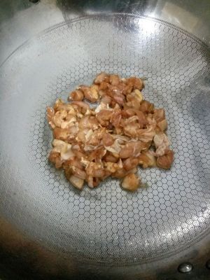 锅洗干净放油烧近六成放鸡肉炒熟,我四五分钟左右。起锅。
