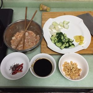 【准备好食材】将鸡肉切丁,加淀粉、水、鸡粉、胡椒粉腌制一会。黄瓜切丁、葱切段、姜切小片。之后用生抽、老抽、水、糖、醋、鸡粉调汁。