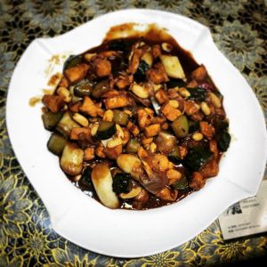 之后,锅中放入花椒、干辣椒、姜片炒香,之后放入葱段和预先调好的汁,接着倒入鸡块翻炒,黄瓜可以根据个人口选择什么时间放入。