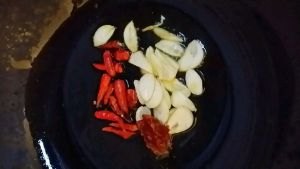 炒锅内留少量的油,依次放入干辣椒段、蒜片、豆瓣酱、老抽、糖和鸡精,翻炒煸香。