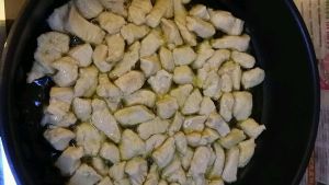 炒锅放稍多点油,将抓过淀粉的鸡肉块放入锅内,翻炒均匀至变色,炒熟后盛出沥油。