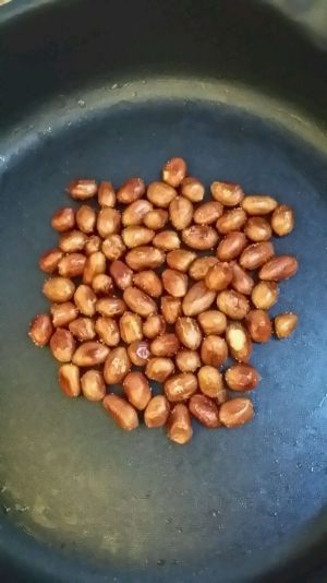 炒锅倒油烧热后放入花生炒熟,盛出备用。