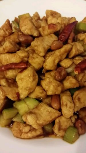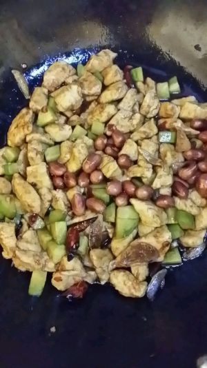 最后放入炸过的鸡肉块和花生,黄瓜丁,盐,翻炒均匀即可。