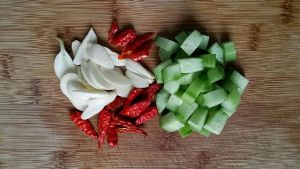 蒜切片,干辣椒剪成小段,黄瓜切丁备用。
