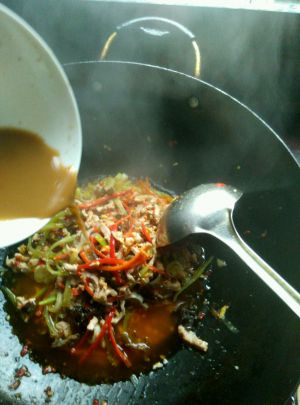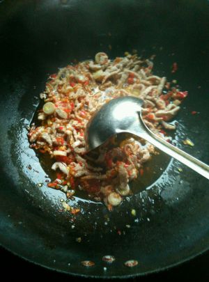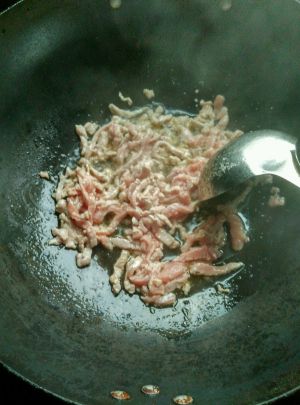 起锅倒油,把肉丝炒八成熟,记住不要炒太久肉会老哦!炒完承出,放置一旁备用