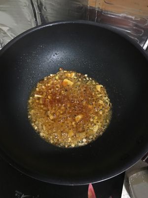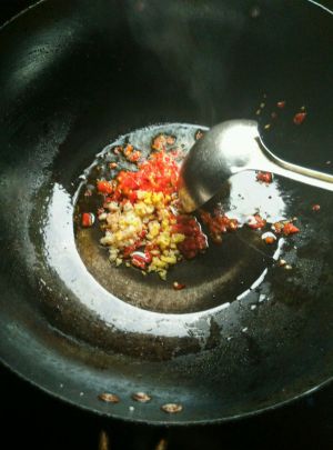 锅入油放入泡椒.姜沫,蒜沫.大葱煸香。